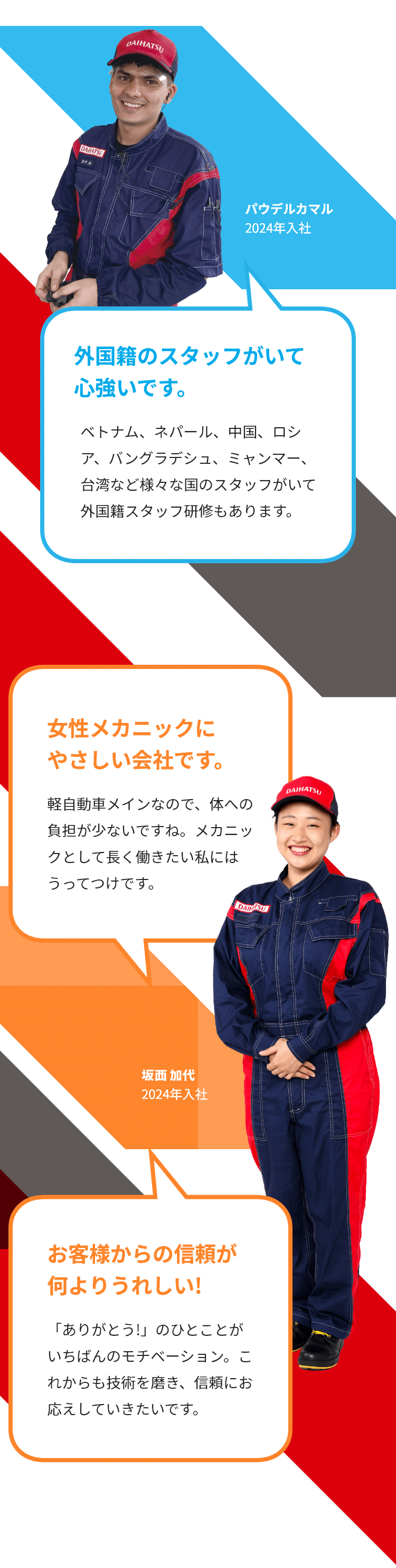 坂西「今はたくさんの経験を積んで吸収し、少しずつレベルアップして、いずれはフロントや工場長までいけるよう頑張りたいと思います。」