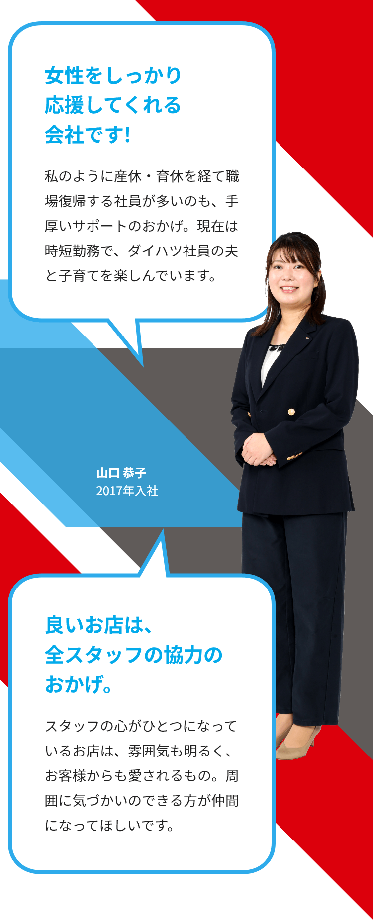 山口「入社してから色々な部署の先輩方に助けてもらいました。お客様だけでなく、周りの社員の方もフォローして支えていけるスタッフを目指していきたいです!」