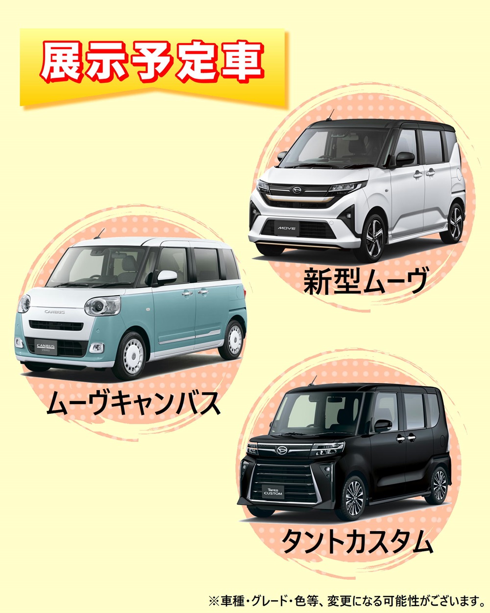 ダイハツ車は人気の軽自動車を3台展示予定!! 試乗できます!!