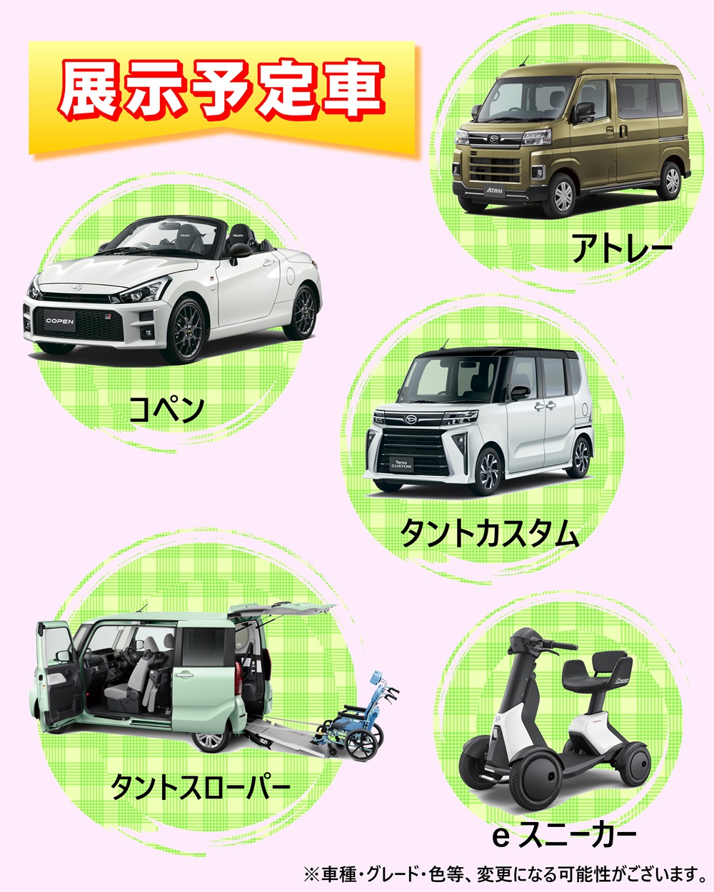 人気の軽自動車を4台に加えて、話題の歩行領域モビリティ「eスニーカー」も展示予定!!
