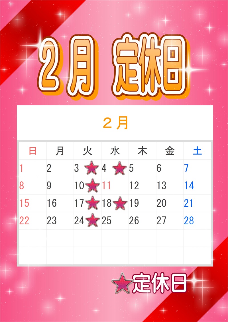 2月のお休みは 火曜日 / 4日(水)・18日(水) となります。