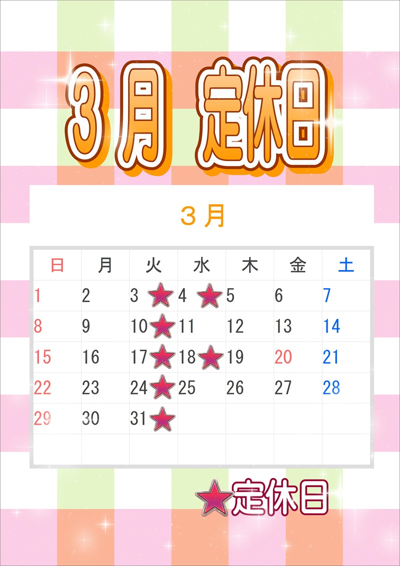 3月のお休みは 火曜日 / 4日(水)・18日(水) となります。