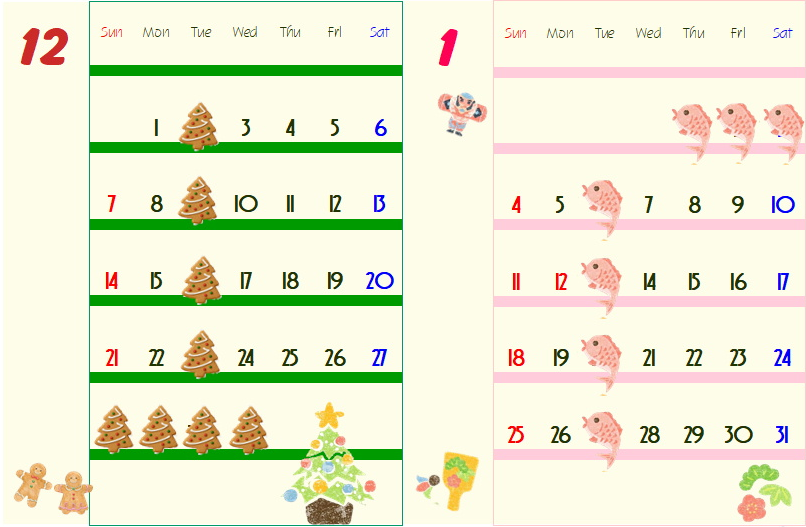 12月はクッキーのマークが定休日、1月は鯛のマークが定休日となります🍂