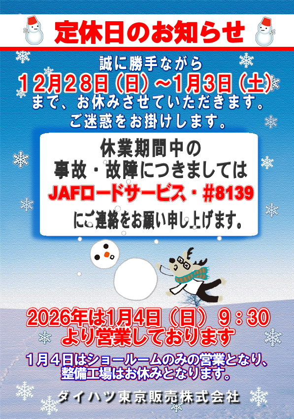 また、1月4日(日)の営業に関しましてショールームのみの営業となり、サービス工場は