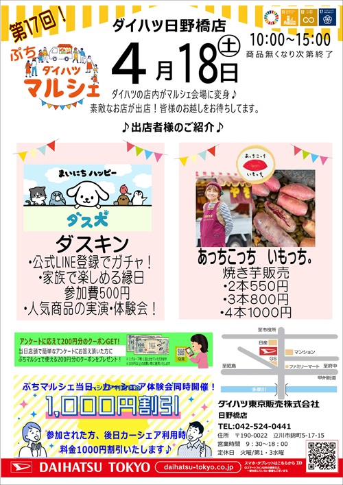 こちらも、ダスキンさんのご協力のもと、 ダイハツ東京のオリジナルキャラクターの「大の発(だいのはつ)」をモデルにして マットを制作してくださいました!! 「大の発」にこれからの日野橋店を見守ってもらいましょう♪ 明日18日土曜日は 日野橋ぷちマルシェ開催です♪ ぜひ、 遊びに来てください♪