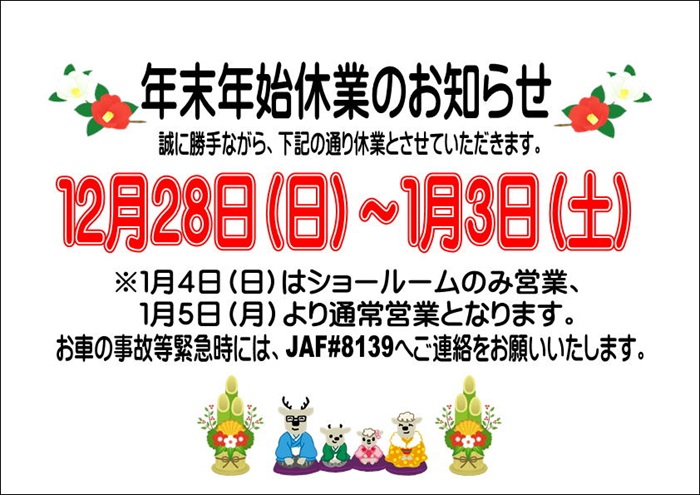 ※1月4日(日)はショールームのみ営業、サービス工場は休業となります。