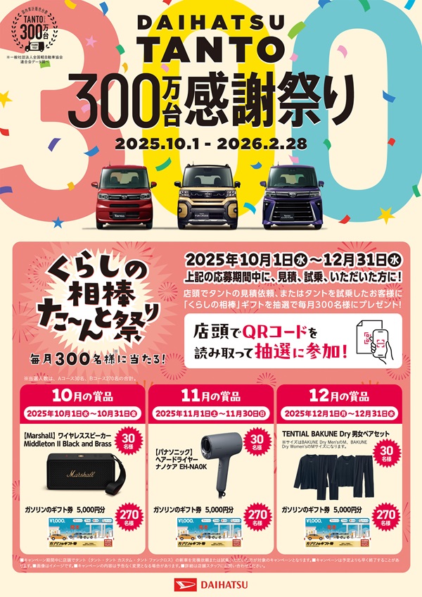 \\ 期間中 店頭でタントのお見積依頼・ご試乗で、「くらしの相棒」ギフト を抽選でプレゼント🎁 //