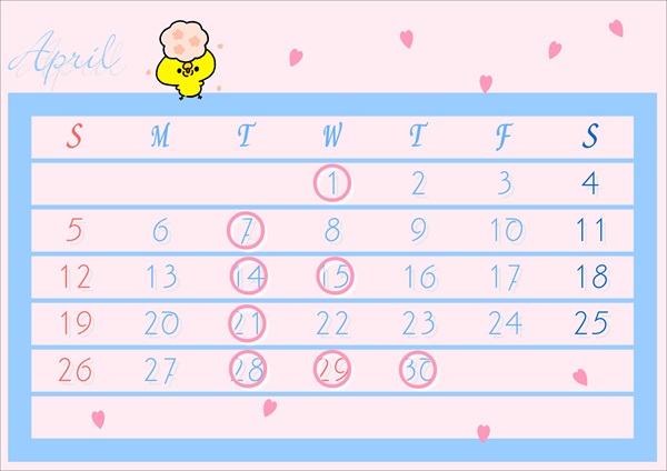 4月は毎週火曜日と1日・15日の水曜日でお休みを、
