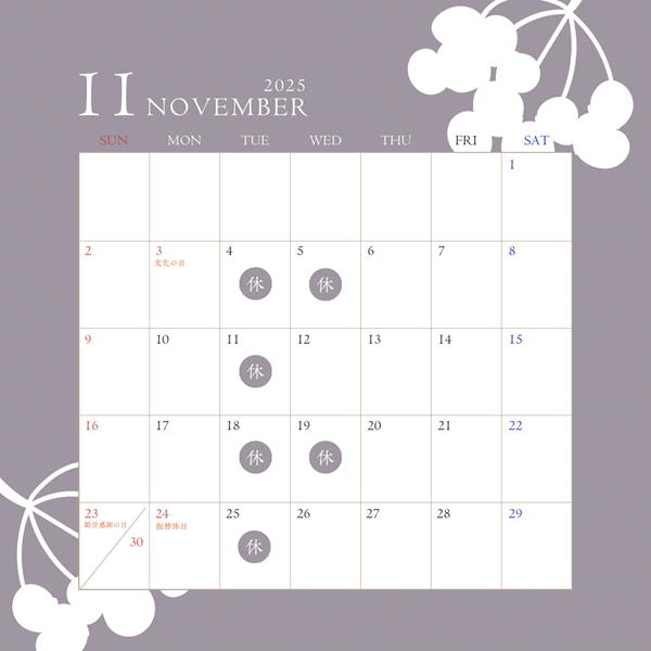 さて今回は、11月の定休日をご案内させていただきます😄