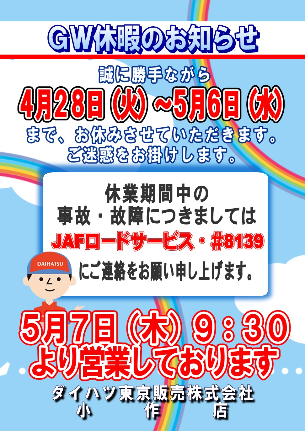 誠に勝手ながら、下記の通りGW休暇とさせていただきます。