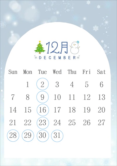 12月は毎週火曜日と12/28(日)~1/4(日)がお休みとなります。