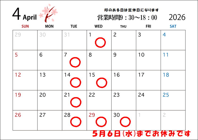 4月は毎週火曜日と第一・第三水曜日が定休日です(`・ω・´)✨