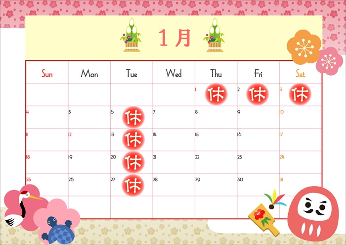 来月の店舗休日、また、年末年始の休暇案内をいたします。