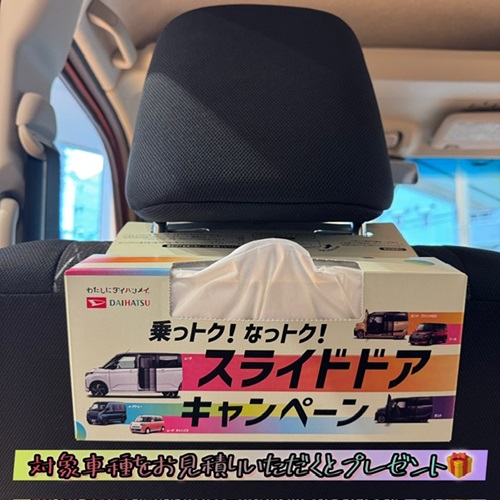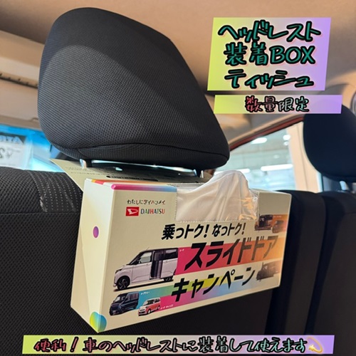 ヘッドレスト装着BOXティッシュを数量限定でプレゼントしています😊