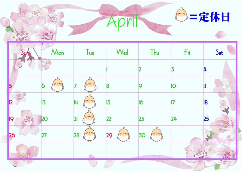 4月はちょっぴりお休み多め。他の店舗とお休みが違いますのでご注意下さいね。
