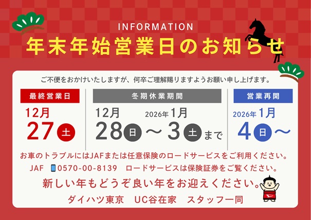 さて、今年もダイハツ東京は冬期休業をいただきます。