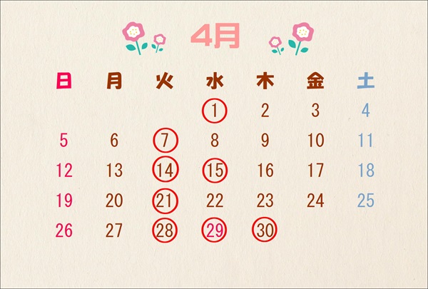 4月は毎週火曜日と第1・3水曜日が定休日となっております。