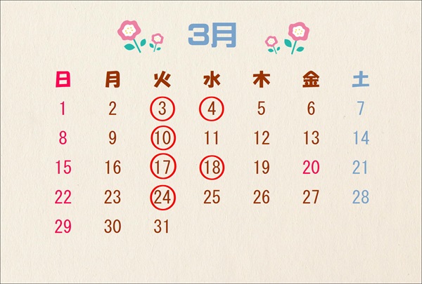 3月は毎週火曜日と第1・3水曜日が定休日となっております。