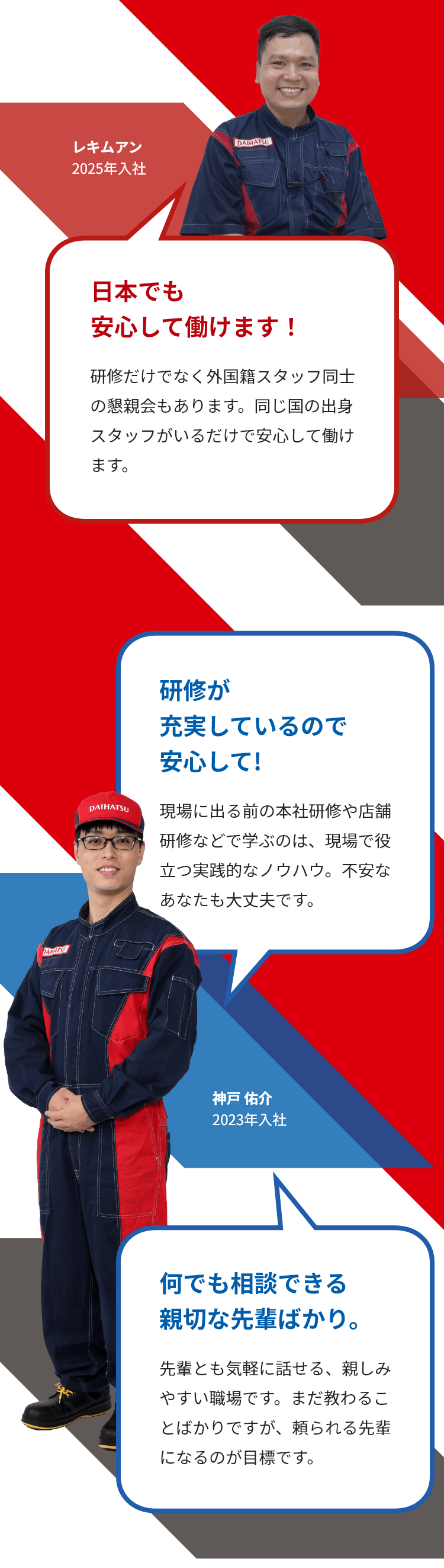 私は大学卒業後、一度就職した後に整備の道に進みました。私自身、ゼロからのスタートで、入社当時はわからないことだらけでした。新入社員研修やダイハツ技術検定研修、その他いろいろな研修・経験を経て、サービス技術コンクールの全国大会に出場することができました。